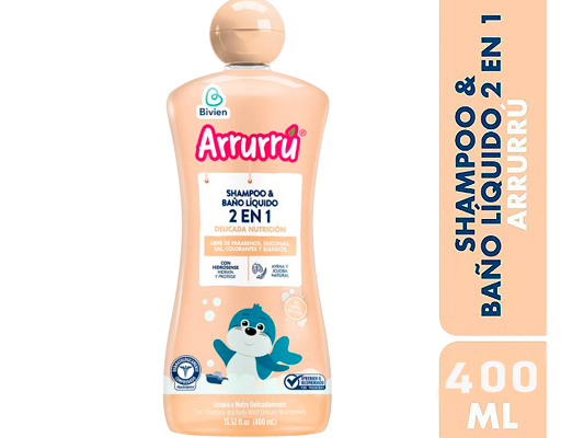 Arrurru Shampoo & baño liquido 2 en 1 delicada nutrición con hidrosense cuida la delicada piel y el cuero cabelludo del bebé manteniéndola protegida e hidratada con una formula que limpia delicadamente.