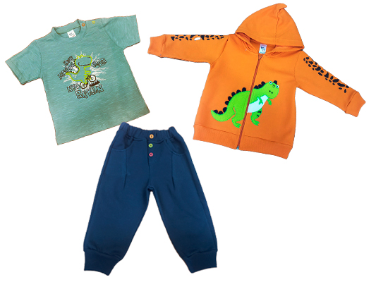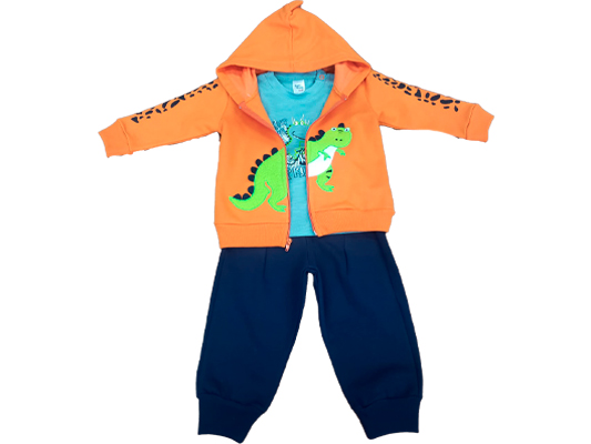 1. Chaqueta naranja en algodón perchado con capota y de cierre con cremallera. Con animación bordada de dinosaurio. Lleva cresta la capota.